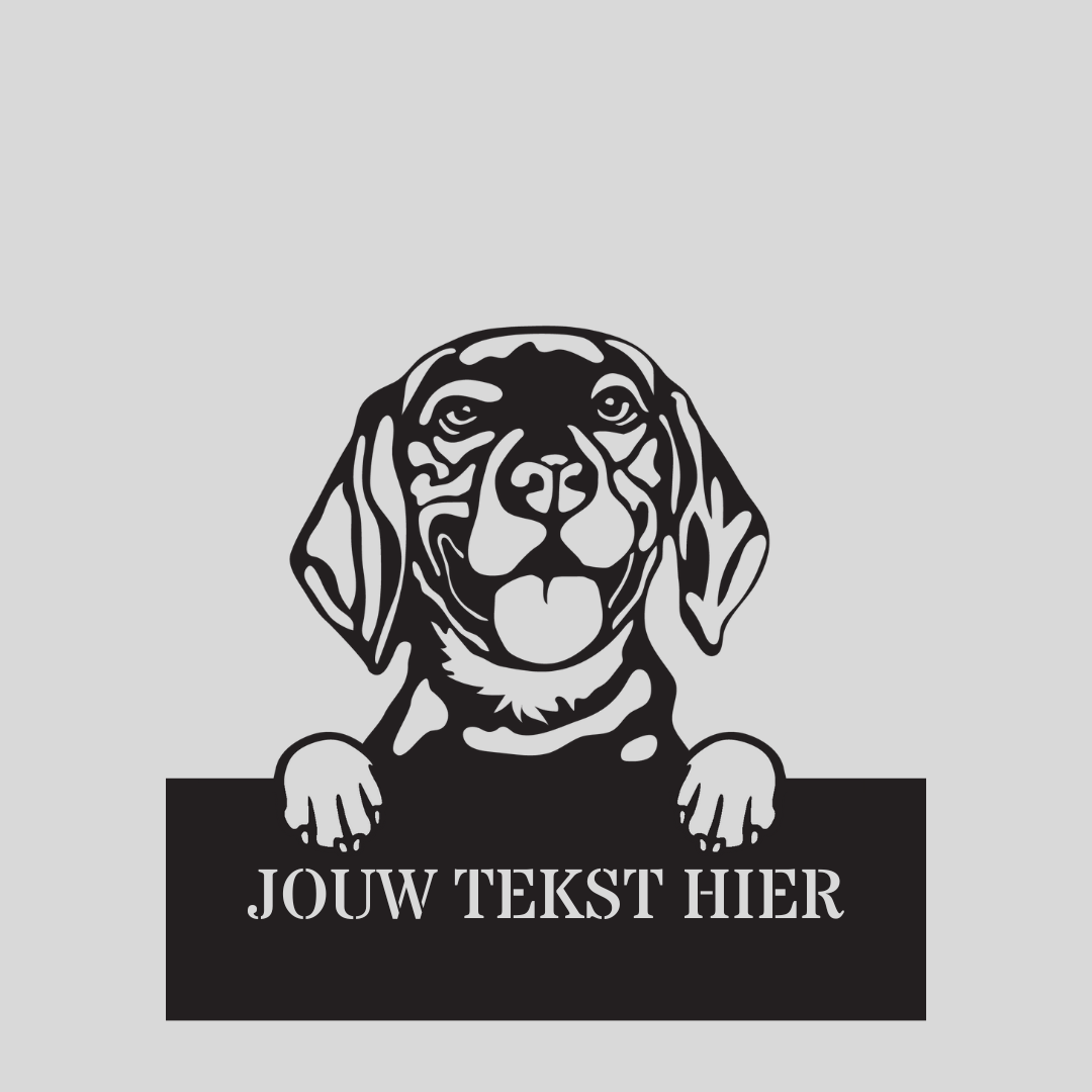 Ontwerp nu je eigen kunstwerk van staal. Zet de naam van jouw hond onder dit Beagle kunstwerk, bijvoorbeeld voor op zijn hondenhok. Verkrijgbaar in verschillende afmetingen en kleuren. Geleverd inclusief bevestigingsmateriaal. De kleuren zwart, goud en koper worden gesneden uit staal en voorzien van een kleur door middel van poedercoating.