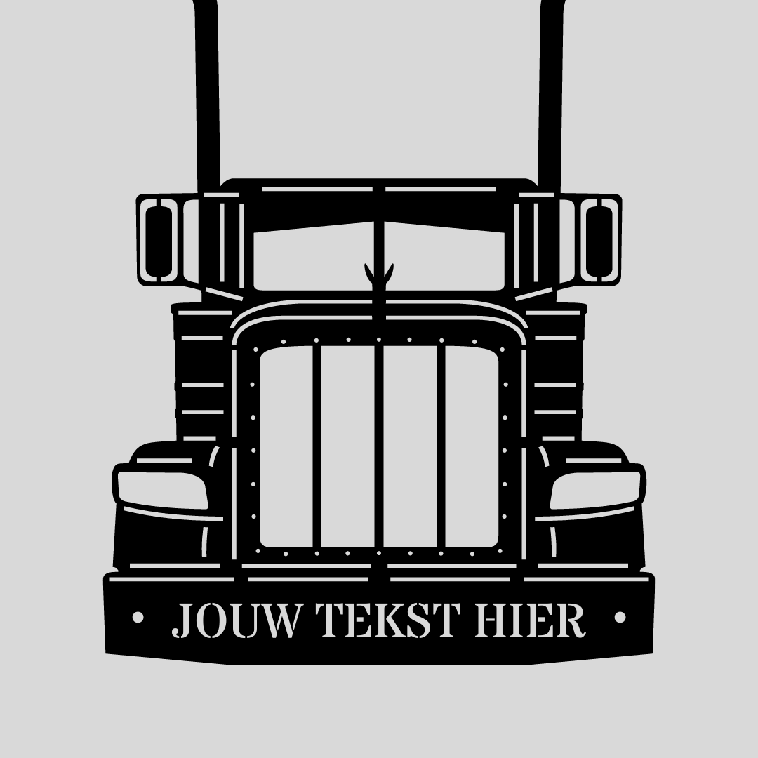 Ontwerp nu je eigen kunstwerk van staal. Kunstwerk van een Amerikaanse USA P- Bilt truck van staal, voeg nu je gewenste naam toe en bestel. Verkrijgbaar in verschillende afmetingen en kleuren. Geleverd inclusief bevestigingsmateriaal. De kleuren zwart, goud en koper worden gesneden uit staal en voorzien van een kleur door middel van poedercoating.