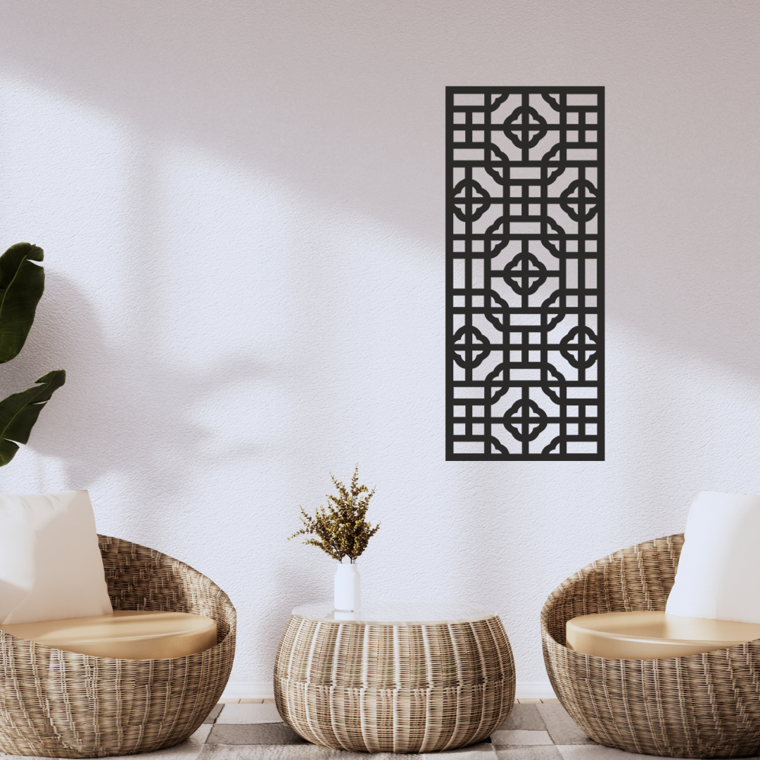 Een chique patroon, dit geeft je interieur een luxe en high-end designelement. Deze wanddecoratie gemaakt uit staal. Verkrijgbaar in verschillende afmetingen en kleuren. Geleverd inclusief bevestigingsmateriaal. De kleuren zwart, goud en koper worden gesneden uit staal en voorzien van een kleur door middel van poedercoating.