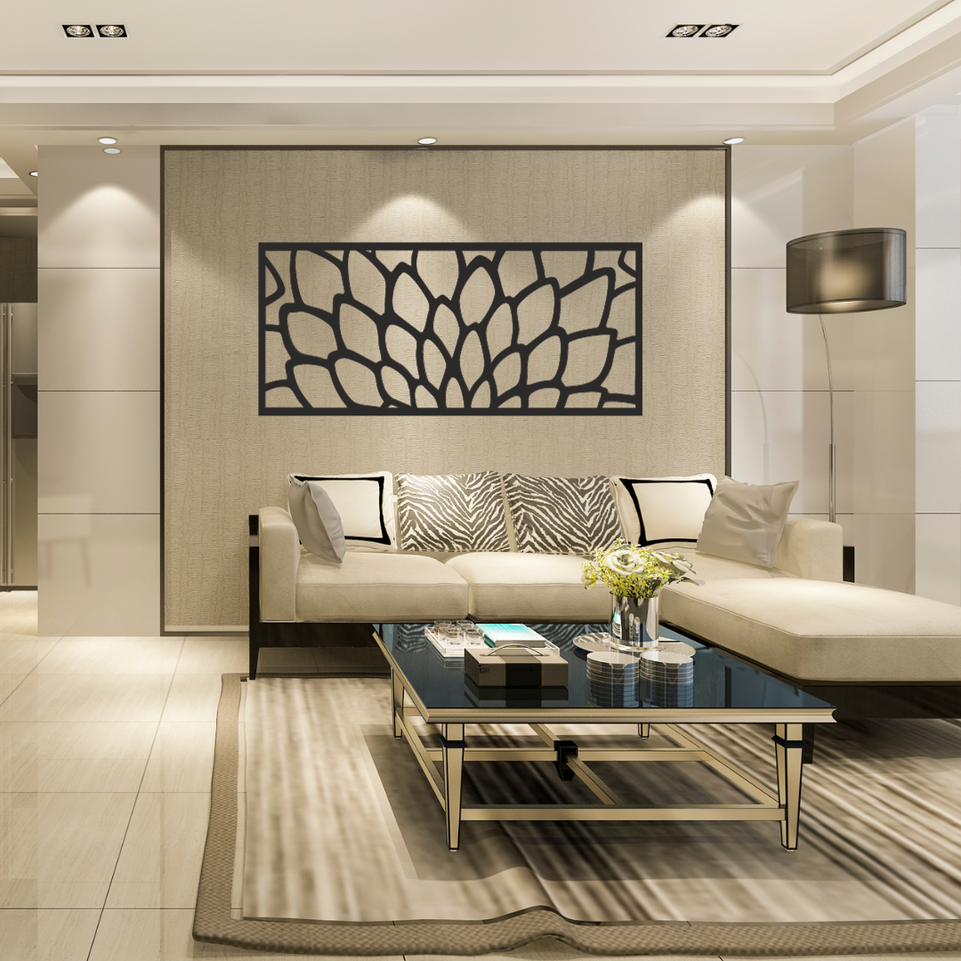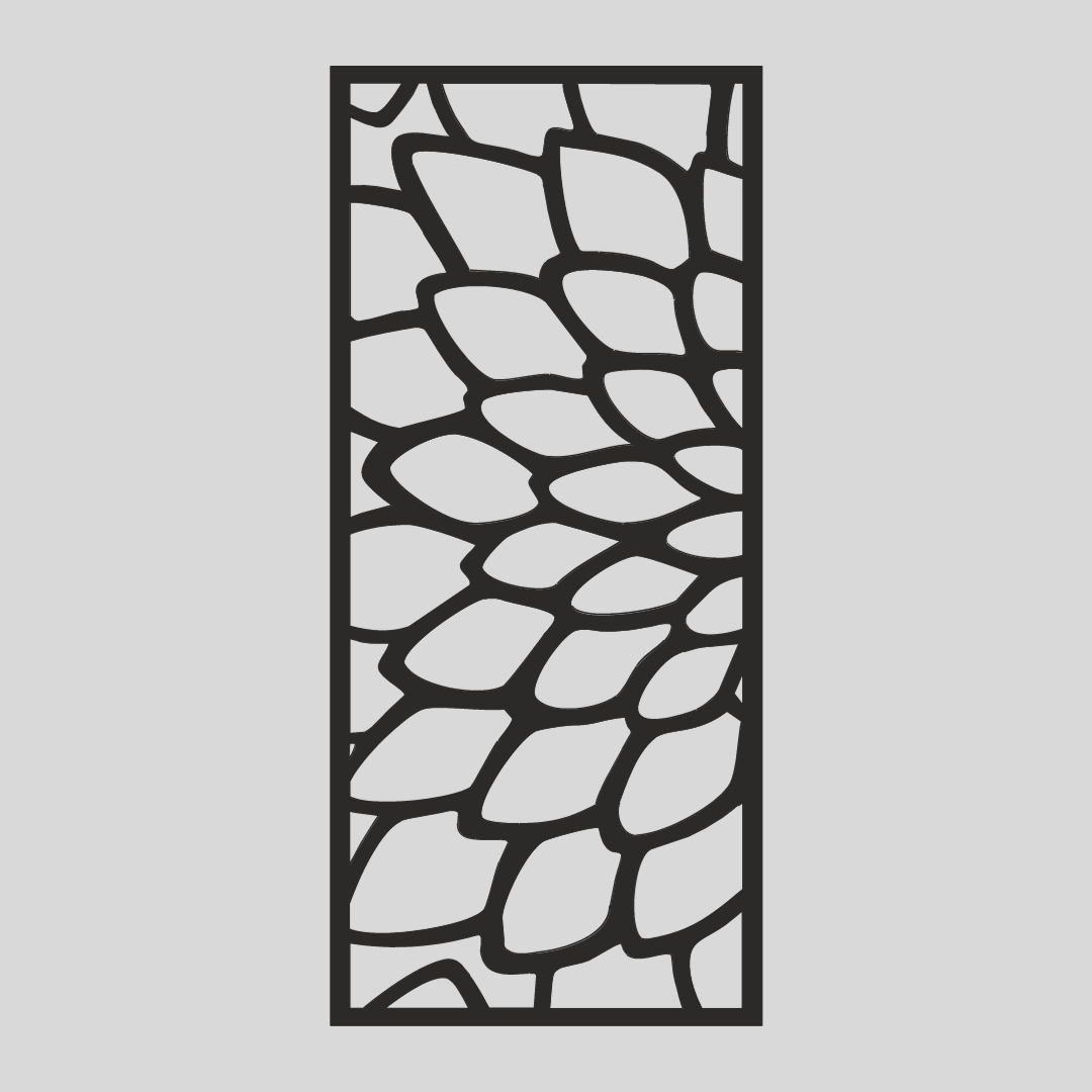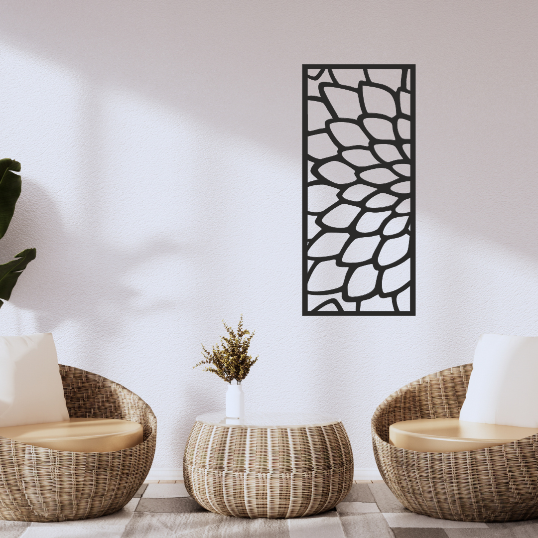 Een patroon van schubben uit staal gesneden, een mooie vorm van wanddecoratie. Verkrijgbaar in verschillende afmetingen en kleuren. Geleverd inclusief bevestigingsmateriaal. De kleuren zwart, goud en koper worden gesneden uit staal en voorzien van een kleur door middel van poedercoating.